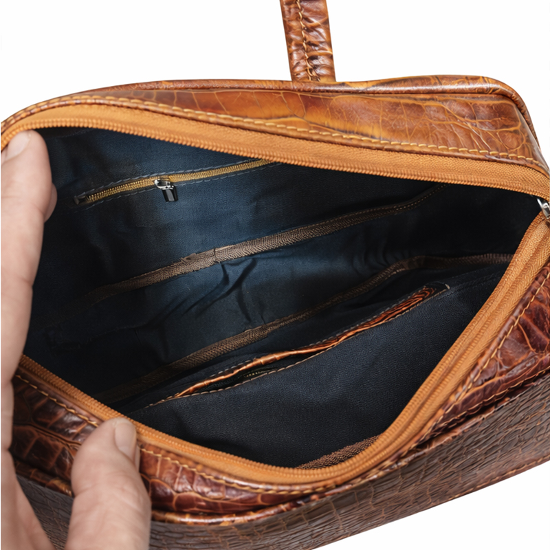 - جنس و بافت: چرم طبیعی گاوی با طرح embossed کروکودیل – بافت فلسمانند بزرگ و برجسته، مقاوم در برابر خطوخش و سایش، حس لوکس و باکیفیت میدهد.