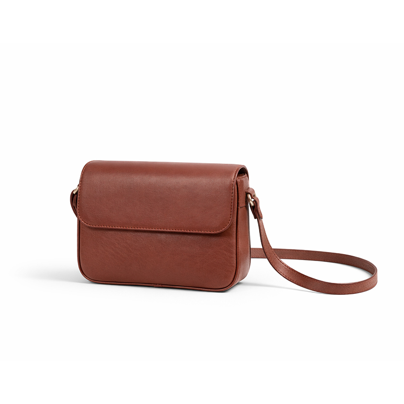 - فرم: شکل مستطیلی کوچک و گرد (flap-over closure ساده با دوخت تمیز)، بند دوشی بلند و قابل تنظیم (برای حمل مورب یا شانهای راحت)، یراقآلات فلزی کوچک و ظریف (حلقه و گیره) – ظاهر خیلی مینیمال و بدون شلوغی.